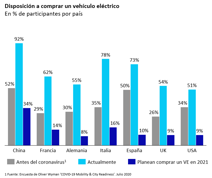 - Según una encuesta de Oliver Wyman, un 73% de los españoles se compraría un vehículo eléctrico y un 10% planea comprárselo en 2021