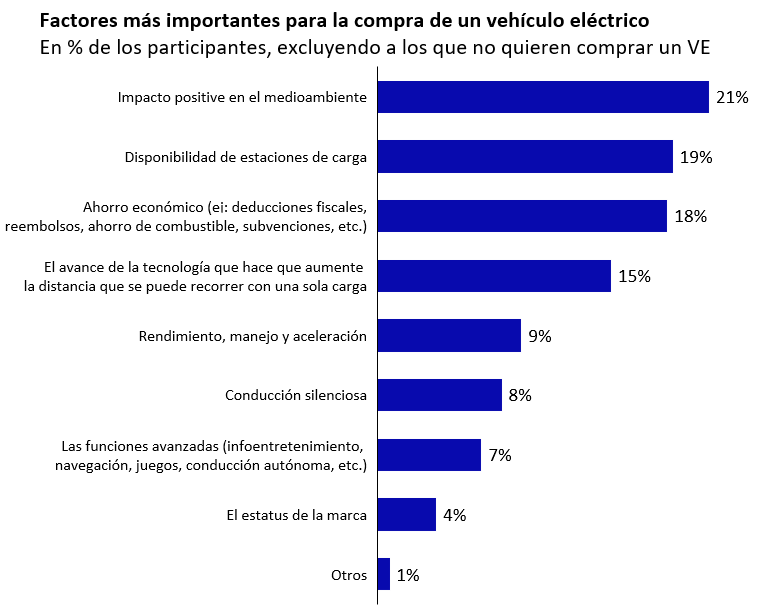 Para la población europea, el segundo factor más relevante es la disponibilidad de estaciones de carga, con un total del 21% de los encuestados que colocan esta opción como su mayor preocupación, una cifra que desciende a un 19% en EEUU y a un 12% en China. Tras esto, el 19% de los europeos sitúan aspectos económicos como claves para la toma de decisión, tales como las ayudas del gobierno, las deducciones fiscales o las subvenciones.