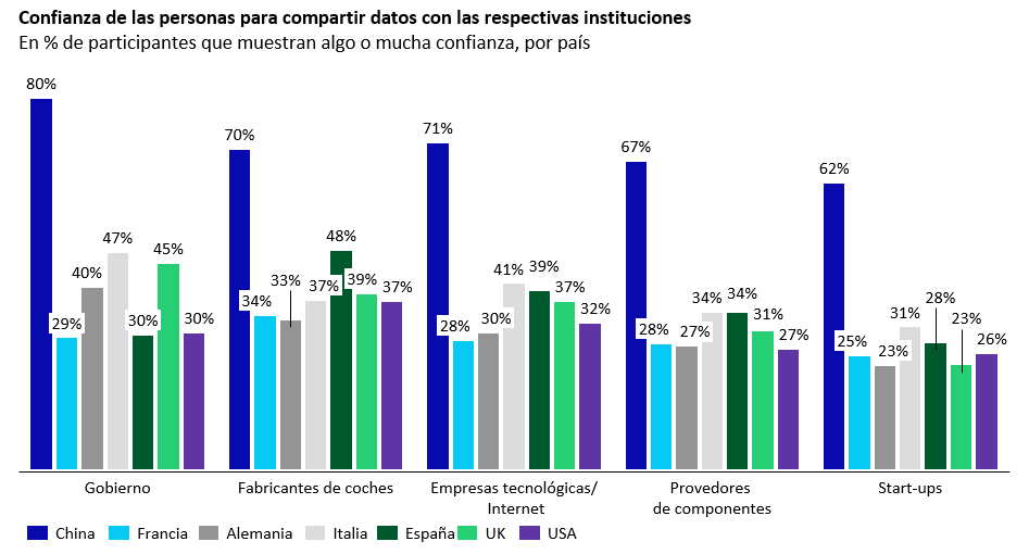 Tras China, que se coloca líder en todos los parámetros de confianza para compartir datos con diferentes entidades, España es el país de todos los analizados que más confía en compartir datos con empresas privadas relacionadas con la fabricación de vehículos. Un 48% de los españoles compartiría datos con los fabricantes de coches, a la vez que un 34% con proveedores de componentes. Unos datos que sorprenden teniendo en cuenta que España es, junto a Francia, el país que menos confía en su gobierno para compartir datos (solo 30% está de acuerdo).