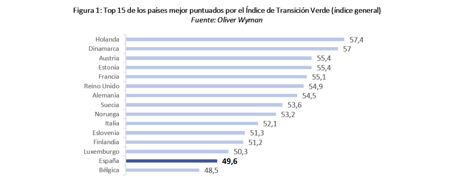 El Índice de Transición Verde sitúa a España en la posición número 14 de 29, con una puntuación de 49,6 sobre 100, por detrás de países de su entorno como Francia o Italia. Si bien queda patente que todavía queda un largo camino por recorrer para alcanzar la sostenibilidad total, nuestro país destaca positivamente en las categorías de Economía y Energía en las que registra la quinta y séptima posición global respectivamente.