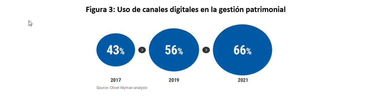 Los rangos de patrimonio más bajos, con menos necesidad de servicios altamente personalizados, prefieren cada vez más modelos de servicio con un alto grado de interacción digital. Sin embargo, los rangos de riqueza más altos también esperan una capa base digital para apuntalar sus interacciones y cambiar hacia plataformas digitales e híbridas.