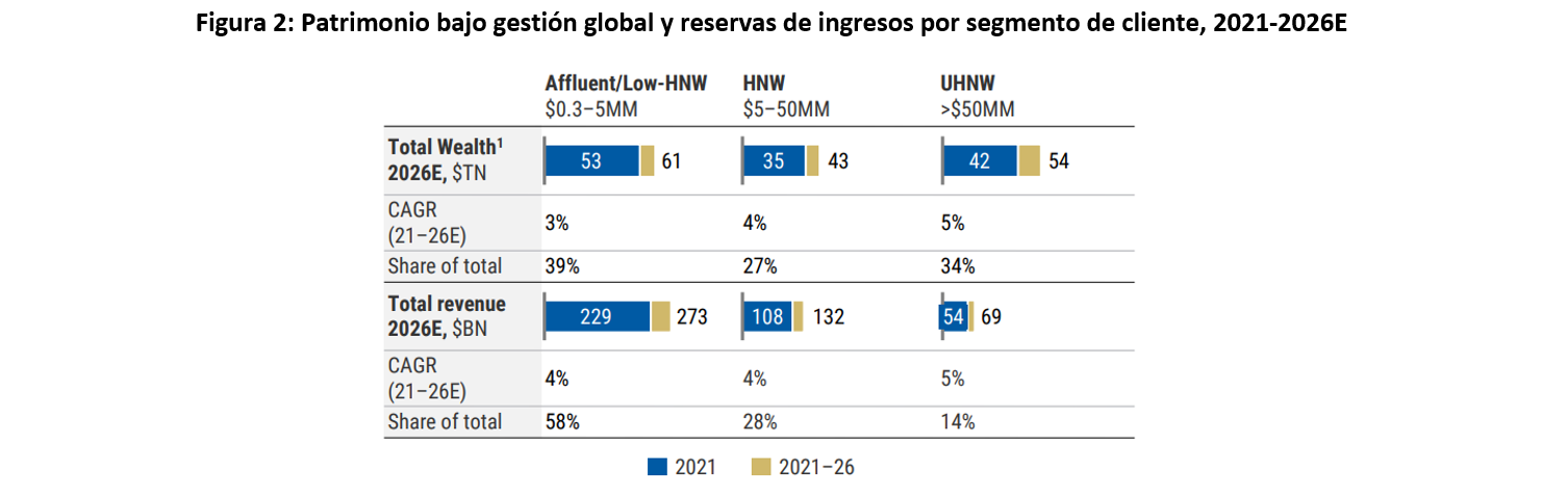 - La mayor oportunidad de crecimiento de ingresos estará en los segmentos de clientes de la banda baja HNW que podría generar alrededor de 45.000 millones dólares de nuevas ganancias y llegar a representar el 60% del total de ingresos de la gestión de patrimonio para 2026.