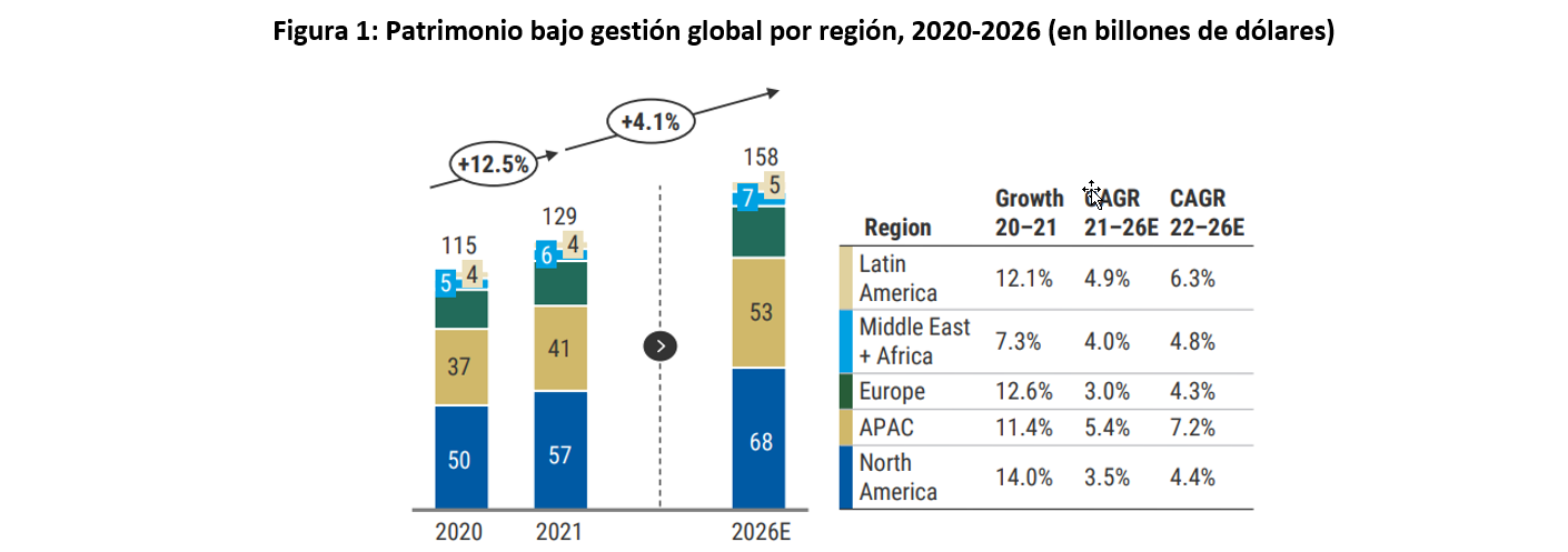 Si bien las regiones de Asia Pacífico (APAC) y América del Norte impulsarán el incremento de la riqueza mundial, concentrando aproximadamente el 80% del patrimonio de nueva creación hasta 2026, el diferencial de crecimiento entre las regiones se está reduciendo. Así, se prevé que para 2026, el patrimonio gestionado en América del Norte se sitúe en 68.000 millones de dólares (desde 57.000 millones en 2021) y en 53.000 millones de dólares en Asia (frente a los 41.000 millones de 2021). Para Europa, tras haber crecido un 12,6% entre 2020 y 2021, se prevé que el patrimonio bajo gestión agregada alcance los 25.000 millones de dólares en 2026 desde 21.000 millones en 2021.