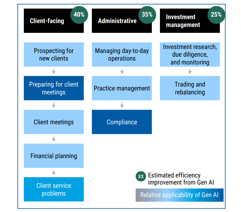 - La implantación de la IA Generativa puede generar un aumento potencial de productividad de entre un 30% y un 40% en los departamentos de ventas y asesoría de las organizaciones de gestión de patrimonios y activos.