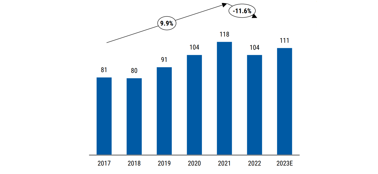 Según Oliver Wyman y Morgan Stanley, la generalización de la desinversión en 2022 causó el recorte de hasta 14 billones de dólares de activos gestionados externamente (AuM, siglas en inglés) a nivel global, cayendo de 118 a 104 billones de dólares tras dos años de crecimiento constante. Sin embargo, durante la primera mitad de 2023, el índice S&P 500 llegó a subir hasta casi un 16% gracias al repunte tecnológico de la IA, que ha ayudado a elevar los activos gestionados externamente a nivel mundial acercándolo a su nivel máximo anterior.