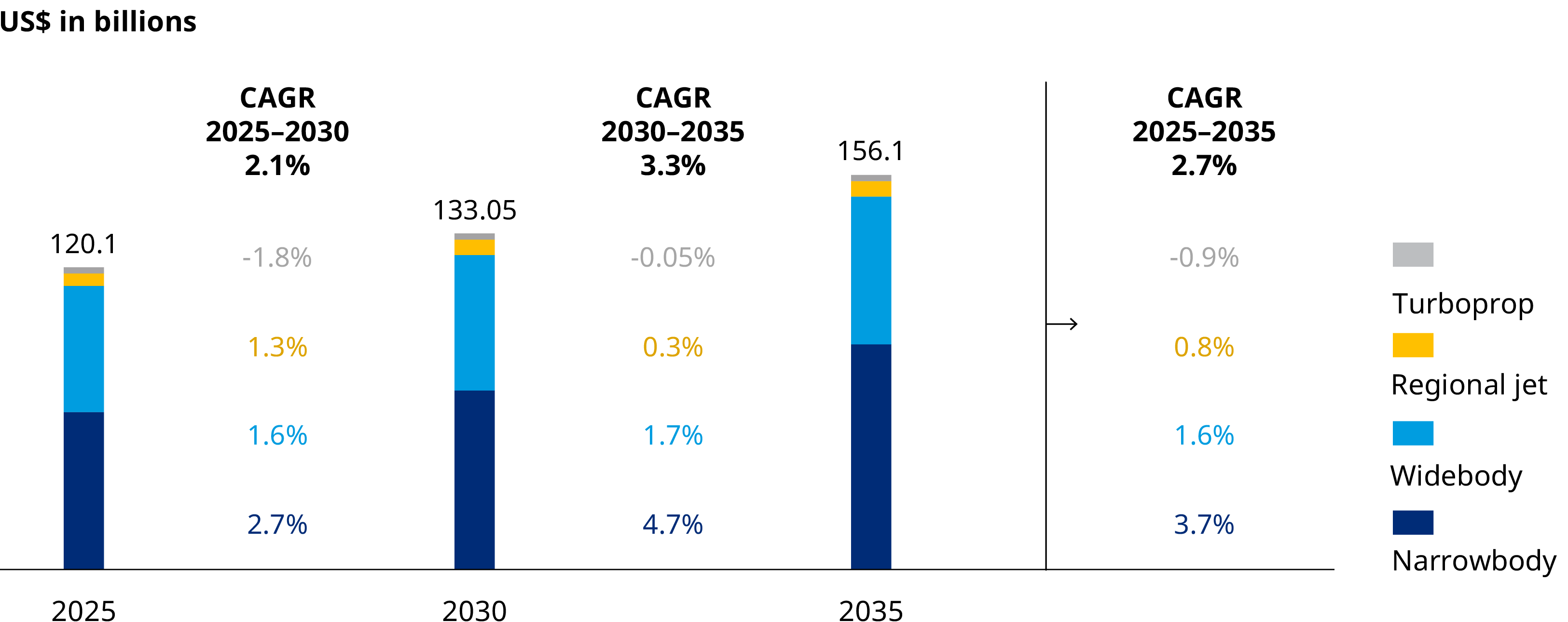 El envejecimiento de la flota, los problemas de durabilidad en aviones y motores de nueva generación, y la creciente demanda de mantenimiento están generando un super ciclo sin precedentes en el sector de mantenimiento, reparación y revisión (MRO). Se estima que el mercado MRO alcanzará los 119.700 millones de dólares este año, impulsado por la necesidad de mantener operativas aeronaves más antiguas. Para 2035, se espera que el sector MRO crezca a una tasa compuesta del 2,7%, alcanzando los 156.800 millones de dólares, un 31% más que en 2025.
