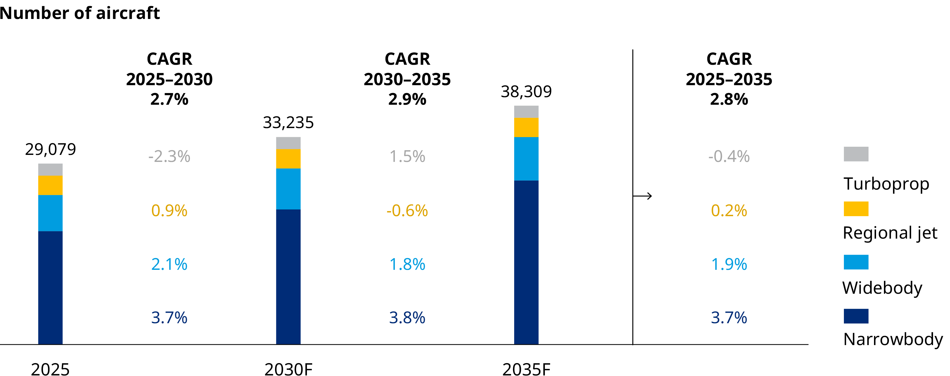 El informe anual indica que se espera un crecimiento del 32% en la flota mundial de aviones comerciales en la próxima década, aumentando de 29.000 aeronaves en 2025 a 38.300 en 2035, con una tasa de crecimiento anual compuesta (CAGR) del 2,8%. Sin embargo, las limitaciones en la producción de aeronaves nuevas y los problemas en la cadena de suministro han resultado en un retraso récord en las entregas y dificultando la capacidad del sector para satisfacer la creciente demanda. Esta situación se agrava por la escasez de mano de obra, que obliga a extender los tiempos de mantenimiento y reparación, especialmente en regiones como Europa Occidental y Norteamérica.